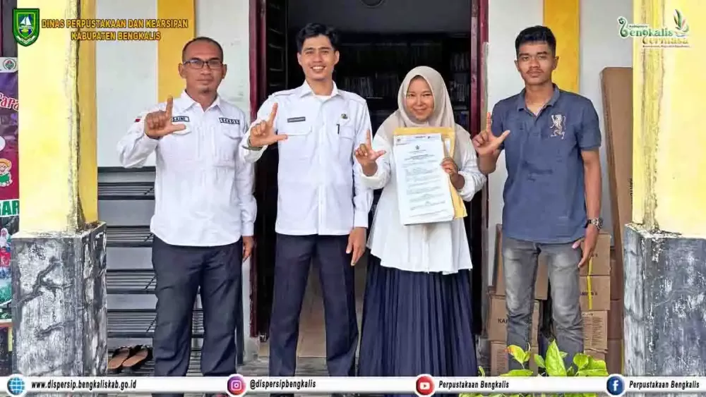 Dispersip Bengkalis-- Kepala Dinas Perpustakaan dan Kearsipan Tuan Guru Haji Ahmad Kabupaten Bengkalis, Hendrik Dwi Yatmoko, S.Sos, MT melalui Heru Hardianto, S.Sos. selaku Pustakawan Ahli Pertama mendampingi Perpustakaan Desa Binaan Dispersip Kabupaten Bengkalis, yaitu Perpustakaan Murai Batu, Desa Batang Duku, dalam rangka penerimaan hibah 1000 bacaan anak bermutu dari Perpustakaan Nasional RI, Rabu (25/6/2025).